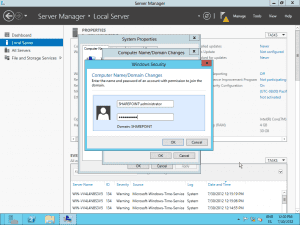 Renombraremos la máquina como SP2013 y la uniremos al dominio sharepoint.local. Al pedir las credenciales de usuario, pondremos las del administrador del dominio (SHAREPOINTAdministrator).