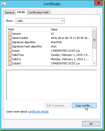 También haremos una exportación del certificado sin la clave privada, para obtener el fichero CertificadoHighTrust.cer. Para ello, tenemos que ir a "Server Certificates" dentro del IIS, abrir el certificado y en la pestaña "Details" ir a la opción "Copy to file" indicando que no queremos la clave privada.