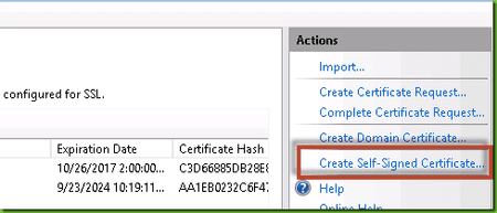 Para crear un certificado autofirmado, iremos a la consola de IIS y bajo el apartado "Server Certificates" y dentro de él la opción "Create Self-Signed Certificate". Le daremos el nombre CertificadoHighTrust.